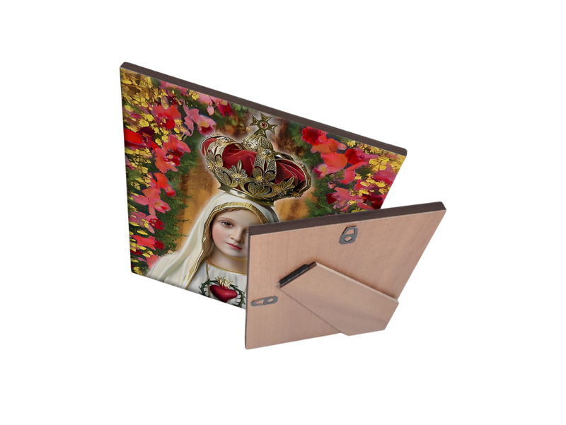 Scopri i tuoi quadri religiosi in ceramica che brilla su legno. Senza cornice, per un impatto visivo pulito, moderno e pieno di luce.