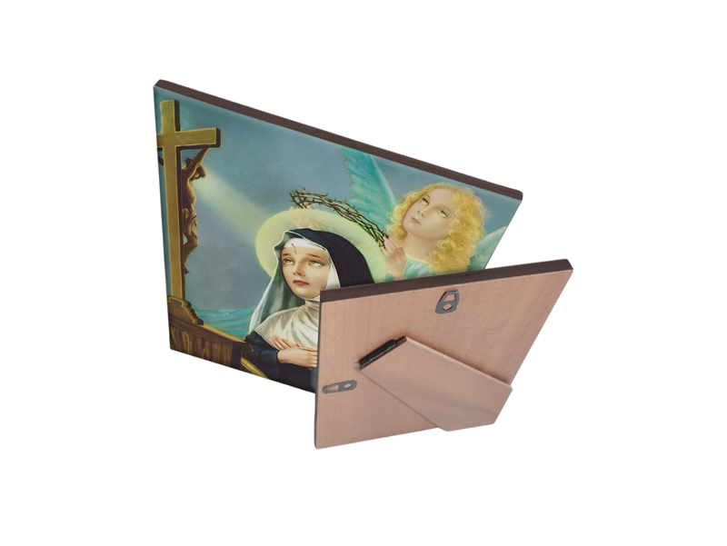 Disponibile in due misure, 20x25 cm e 20x15 cm, può essere esposta su un mobile o appesa al muro, adattandosi armoniosamente a qualsiasi ambiente. La figura di Santa Rita da Cascia, simbolo di fede e devozione, è riprodotta con straordinaria precisione sulla ceramica pregiata, esaltata dalla calda eleganza del legno.